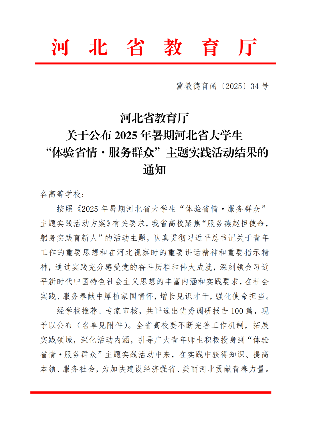 2026.01在河北省教育厅公布的2025年暑期河北省大学生“体验省情·服务群众”主题实践活动优秀调研报告评选中,由我校国际商学院陈一凡同学担任负责人。