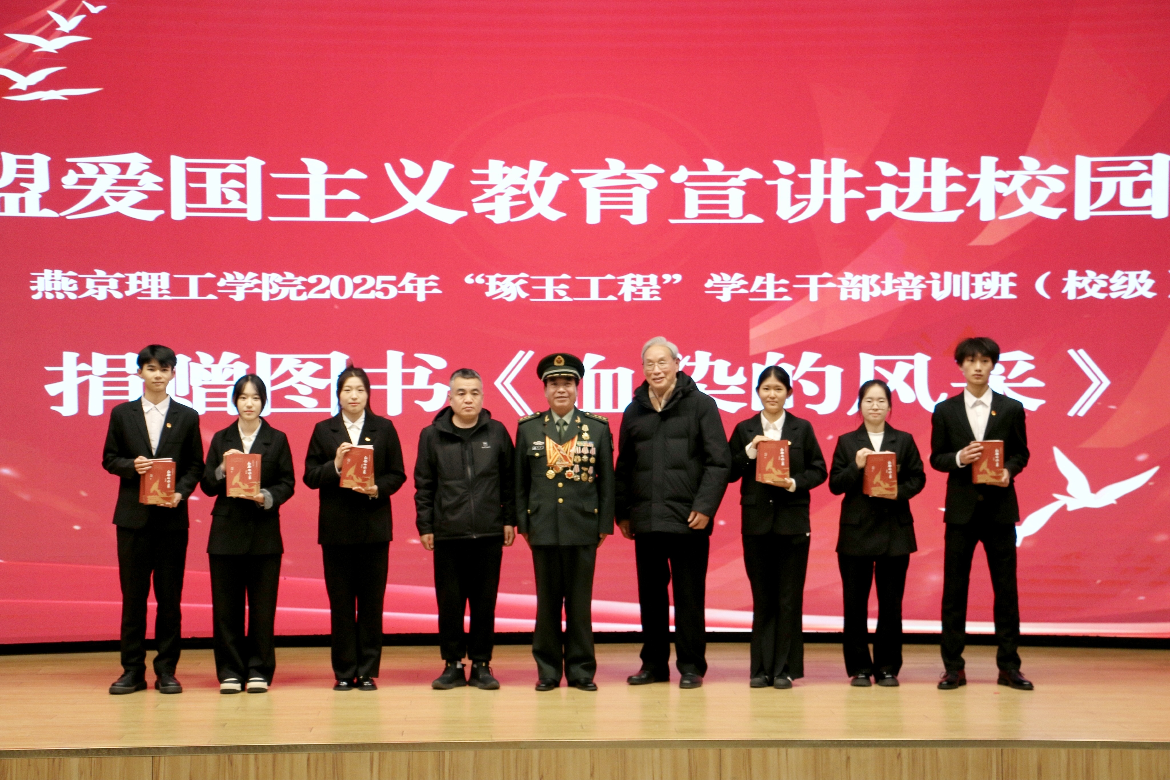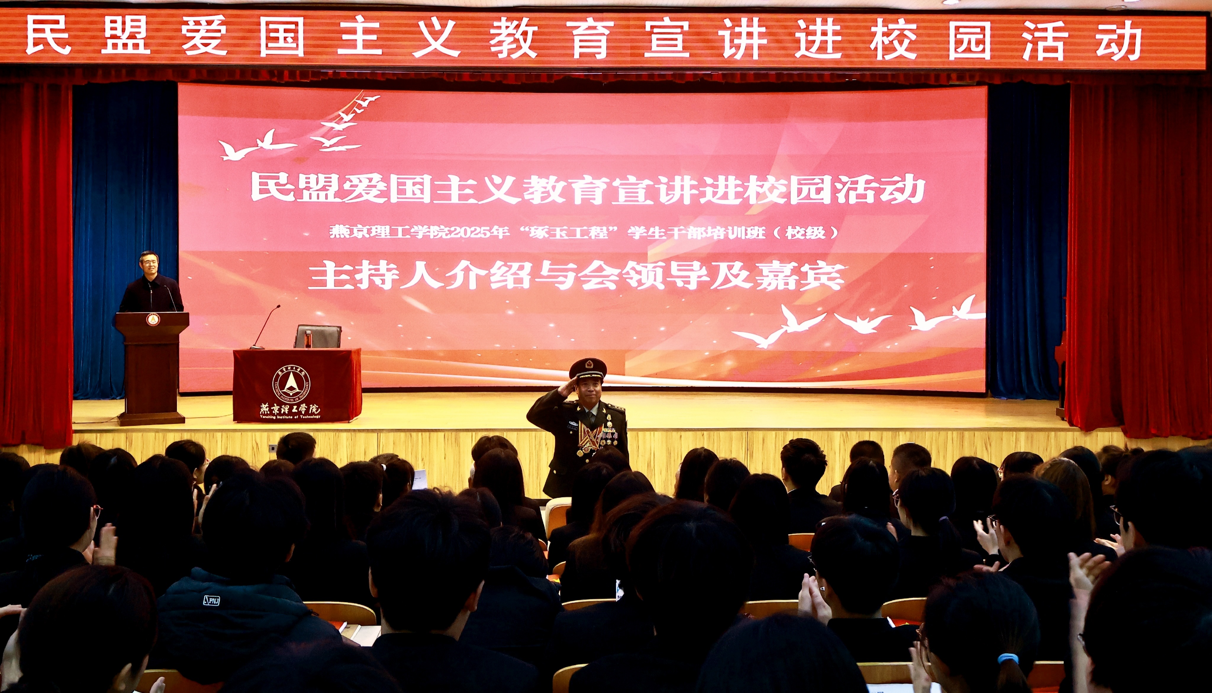 为涵养青年学子的家国情怀,赋能学生成长,激励广大青年在强国建设、民族复兴的新征程中贡献青春力量,12月24日,民盟爱国主义教育宣讲进校园暨燕京理工学院“琢玉工程”学生干部培训在燕京理工学院报告厅举行。国家一级战斗英雄张茂忠,北京安立军休所老首长代表、参战老兵史振杰大校,西柏坡儿女联谊会会长刘鹏、民盟廊坊市委专职副主委李海滨等一行16人莅临指导。燕京理工学院党委副书记、副校长王传超,党委学工部部长宣银,统战部部长张传凤,团委副书记杨文静以及各学院学生代表出席活动。活动由党委学工部部长宣银主持。
