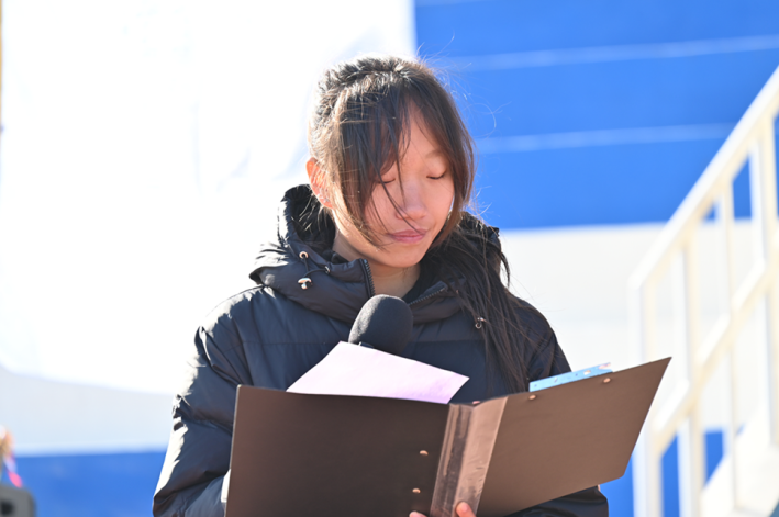 体育学院体教2408班赵楠同学代表参赛队员上台宣誓:严格遵守比赛规则,坚决服从裁判,尊重对手与观众。以饱满的热情、拼搏的精神,赛出风格,赛出水平,发挥出最佳水平。